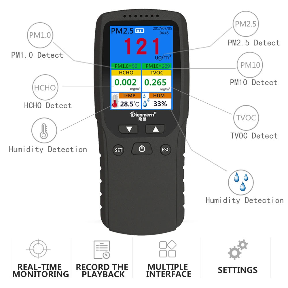 Sản phẩm này là một máy dò chất lượng không khí đa chức năng phát hiện Formaldehyd (HCHO), Hợp chất hữu cơ dễ bay hơi (TVOC), Vật chất hạt <2,5 micron (PM2,5 / 10/10), Nhiệt độ và Độ ẩm với chức năng ghi và đồng hồ . Là một thiết bị phát hiện chất lượng không khí khoa học, nó kết hợp nhiều cảm biến không khí với quạt tích hợp để cho phép theo dõi formaldehyd (HCHO) theo thời gian thực, tổng các hợp chất hữu cơ dễ bay hơi (TVOC), PM2,5 / 1,0 / 10, nhiệt độ và độ ẩm trên màn hình LCD kỹ thuật số của nó.