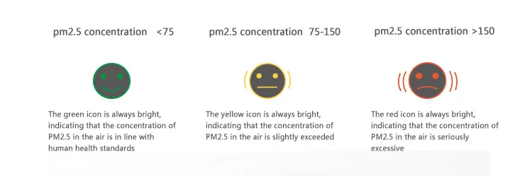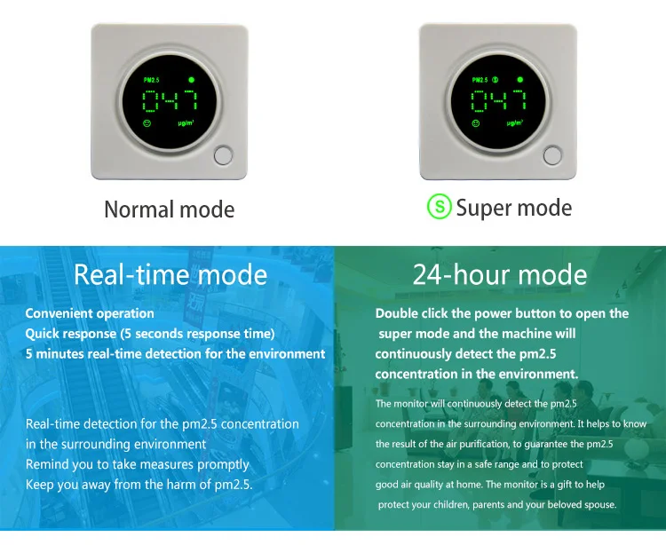 Với các cảm biến pm2.5 dựa trên laser có liên quan, màn hình này có thể phát hiện chính xác nồng độ pm2.5 trong không khí xung quanh các tình huống khác nhau. Nếu vượt quá nồng độ, nó sẽ nhắc nhở bạn ngay lập tức. Siêu chế độ được sử dụng để hiển thị nồng độ pm2.5 thời gian thực và giúp giữ nó ở một phạm vi tiêu chuẩn.